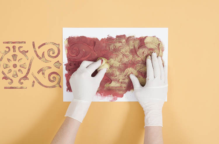 • Do namalowania wzoru potrzebne będą: farby Magnat: S24 Kuszący Rubin i S19 Blask Kakcytu oraz tampony z gąbki.