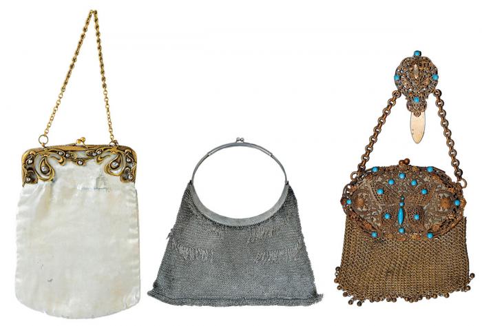 Torebka balowa z mosiądzu, zdobiona syntetycznymi turkusami, lata 30. XX w., Czechy lub Niemcy, cw 400 zł, RYNEK SZTUKI Torebka atłasowa z motywem falującej, secesyjnej wici, z częściowo srebrzoną, mosiężną oprawą, 1905-1910 r., Polska, Muzeum Narodowe w Krakowie. Ta srebrna balowa torebka waży 269 g, lata 20. XX w., cw 1200 zł, DESA UNICUM