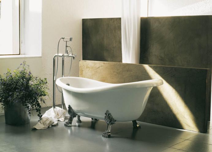 Ceramiczna wanna Epoca w stylu retro z kolekcji Working Form od włoskiej firmy Disegno Ceramica. Zapłacimy za nią ok. 36 000 zł. Cztery mosiężne nóżki – ok. 5300 zł. Bateria podłogowa – ok. 7000 zł. CORAM