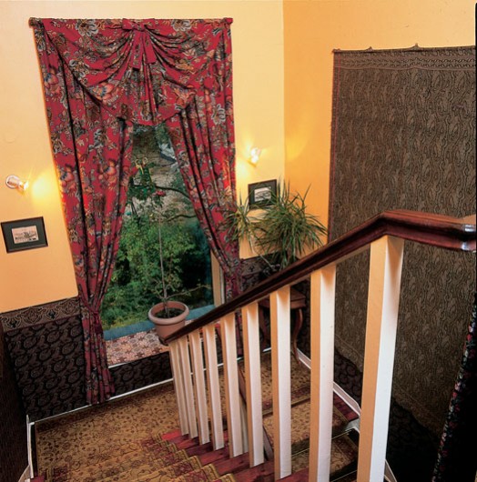 • wzorzysty dywan, zasłony i kilim na ścianie - tkaniny sprawiają, że klatka schodowa też jest umeblowana .