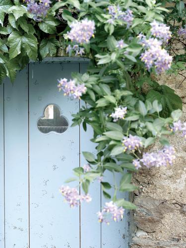 • Błękitne drzwi otoczone kwitnącymi kwiatami.