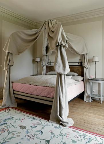 • Apartament Gustavienne. Wygodne łoże ozdobione jest haftowanym lnem.