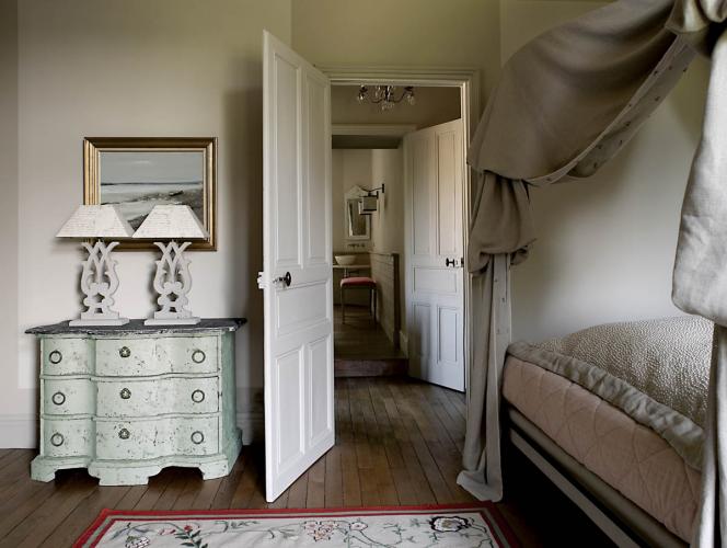 • Przy łóżku z baldachimem stoją stoliki i lampki.