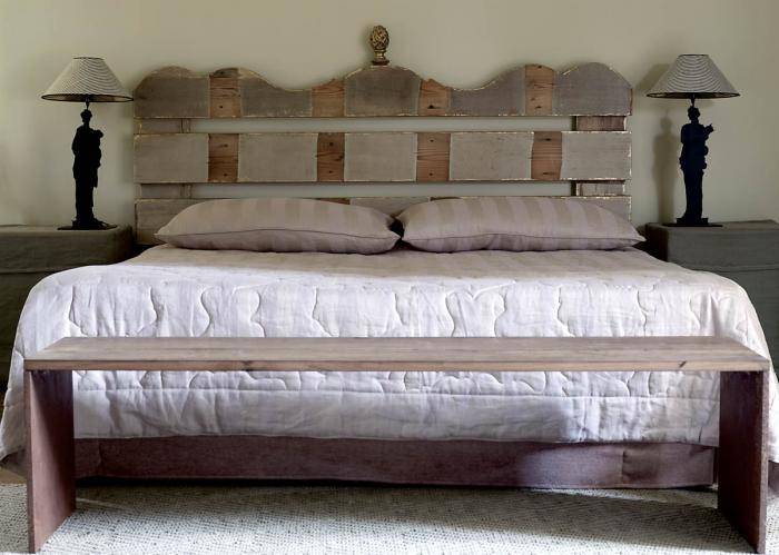 Łóżko ma wezgłowie z desek, które pozostały ze starych wrót do zamku.