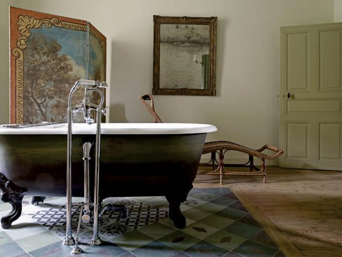• W łazience znajdziemy wolnostojącą wannę na zdobionych nóżkach.