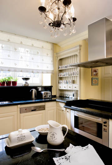 Kuchenne szafki w angielskim stylu przykryto blatem z czarnego kamienia. Z klasyczną formą mebli kontrastuje najnowsze agd.