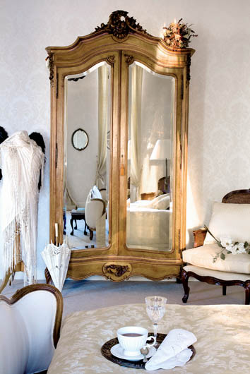 Szafa do sypialni przyjechała z Francji. W oryginalnych kryształowych lustrach pięknie odbija się światło.