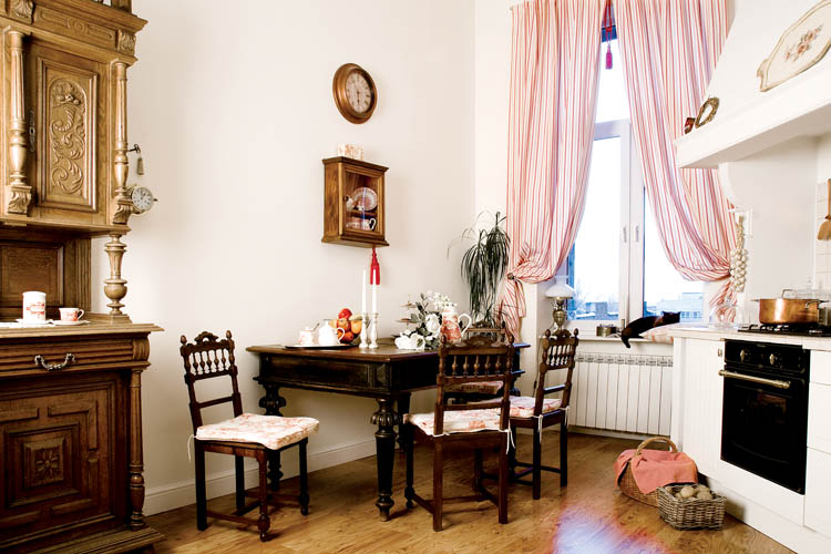 W przestronnej kuchni znalazło się miejsce na jadalnię (stół w kształcie trapezu, choć to antyk, okazał
