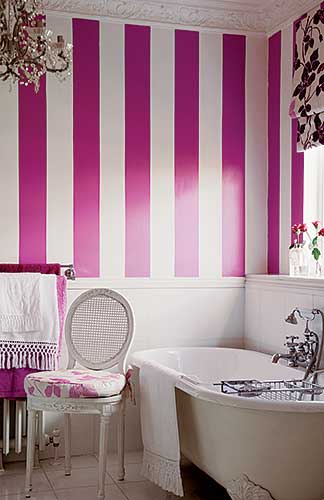 W łazience tapeta w biało różowe pasy.