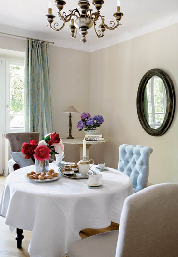 Chłodny błękit pikowanego fotela i zasłon przełamują ciepłe biele, beże i ecru.