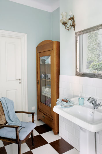 Ceramika w stylu retro, do tego białe płytki-cegiełki, szachownica na podłodze i jeden, dwa mebelki z przeszłością.