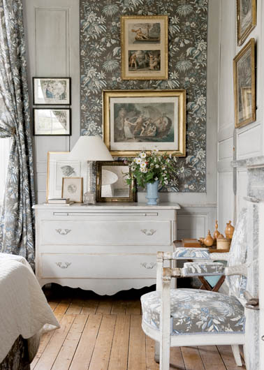 W sypialni motywem przewodnim jest szara tkanina z kwiecistym wzorem.