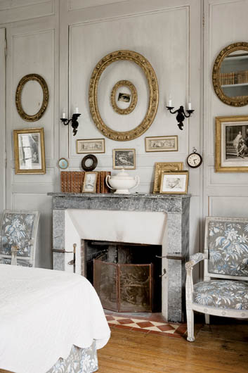 Dominującą w sypialni tkaninę Charles dobrał do oryginalnego potralu kominkowego z szarego marmuru.