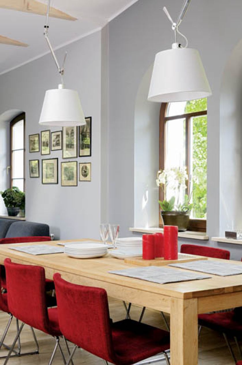 Czerwone krzesla w jadalni ożywiają stonowaną kolorystykę wnętrza.