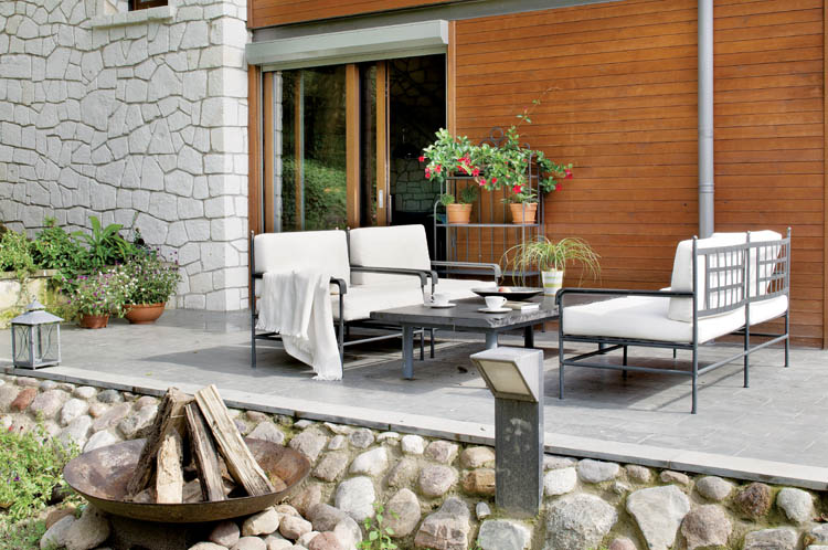 Na tarasie stoją dizajnerskie fotele Unopiu. Obok palenisko wzorowane na marokańskim kociołku.