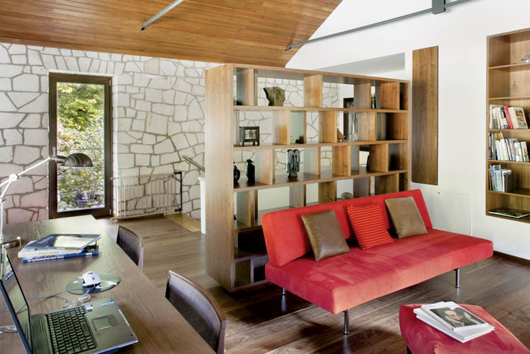 Centralne miejsce w pokoju na górze zajmuje czerwona kanapa.