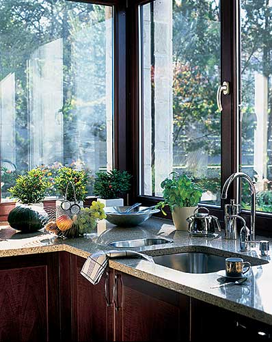 Kuchnia z dużym narożnym oknem kuszącym widokiem.