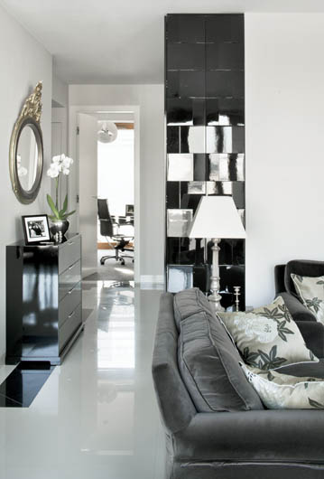 Fronty czarnej garderoby w korytarzu, wykończone na wysoki połysk, sprawiają, że meble mają głębię, są