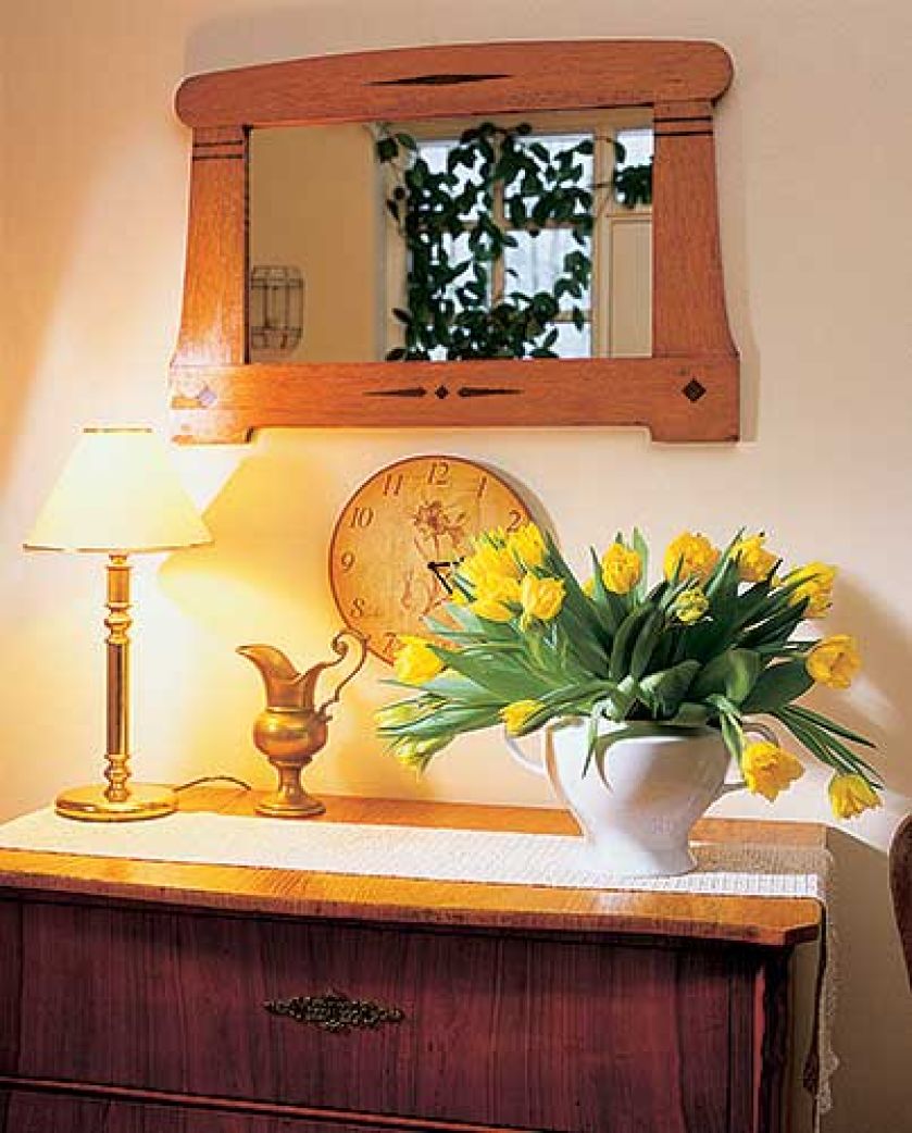 Nad komodą wisi lustro w zdobionej ramie.