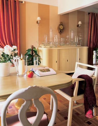 Na szafce stoi szklana kolekcja. Przytulne wnętrze domu w stylu rystykalnym