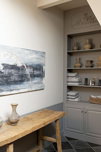 Szare meble zostały połaczone z dodatkami z naturalnego, starego drewna.