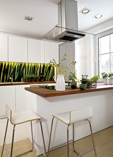 Podświetlone motywy splątanych pędów bambusa wsunięte pomiędzy tafle laminowanego szkła nad blatami. Pomysł prosty, a