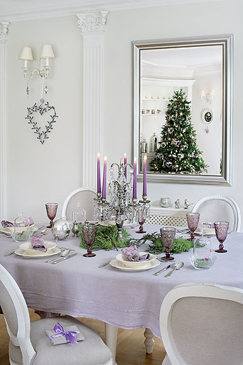 Konsekwentnie dobierane dodatki, nawet stół ubrany jest w kolorach lawendy.