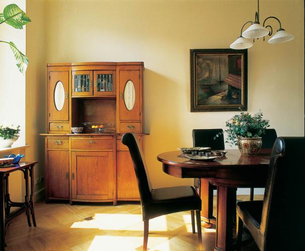 W jadalni, którą w razie potrzeby można połączyć z salonem, stoi jeden z najstarszych mebli w domu. Stuletni kredens-