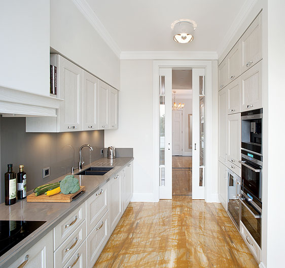 Na podłodze włoski marmur spod Sieny w ciepłym dyniowym odcieniu.