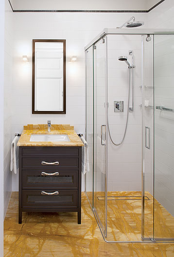 Na podłodze włoski marmur spod Sieny w ciepłym dyniowym odcieniu.