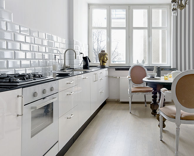 Proste szafki z białymi frontami w towarzystwkie antycznego stołu i krzeseł.