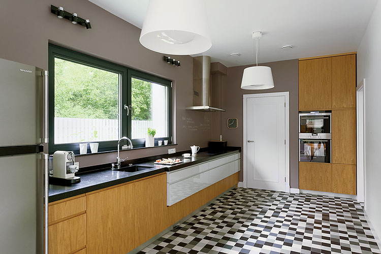 Proste szafki, stonowane kolory i ciekawa kolorystycznie podłoga.