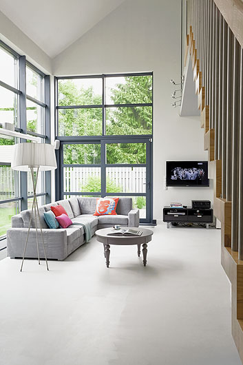 Ogród zagląda do środka, a niebo odbija się w podłodze.