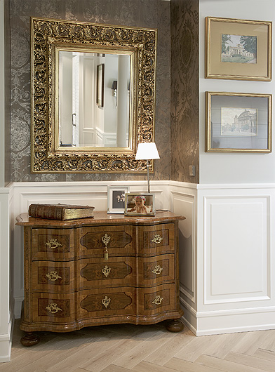 Dla przełamania dominującej czerni - antyczna brązowa komoda i lustro w barokowej ramie.