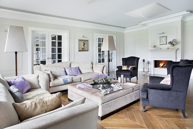 Miękkie meble w salonie zaprojektowała architektka Paulina Taff-Piotrowska. Klasykę przełamują nowoczesne lampy: sufitowa