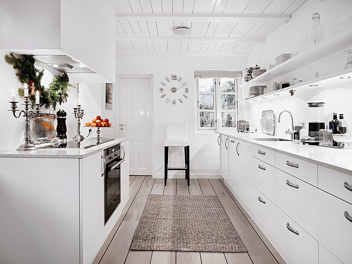 Proste białe meble i drewniane deski na podłodze - typowy styl skandynawski.