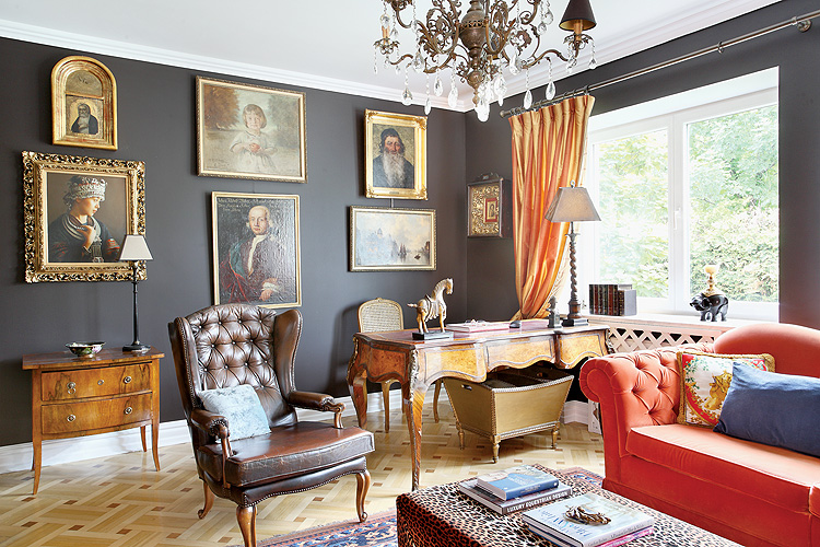 W klasycznym gabinecie z pikowanymi fotelami i kanapą znalazło sie miejsce na zabawny akcent - stolik w panterkę.