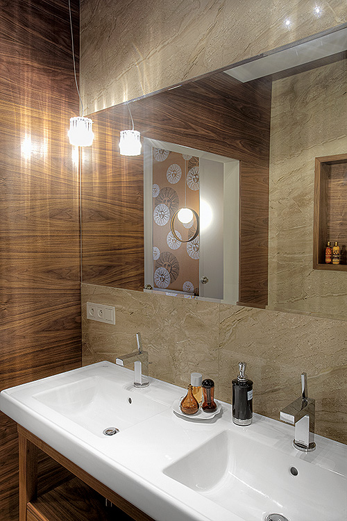 Połączenie marmuru Daino Reale i Emperador oraz mozaiki Bisazza Nefertiti za srebrnymi elementami to ciekawe