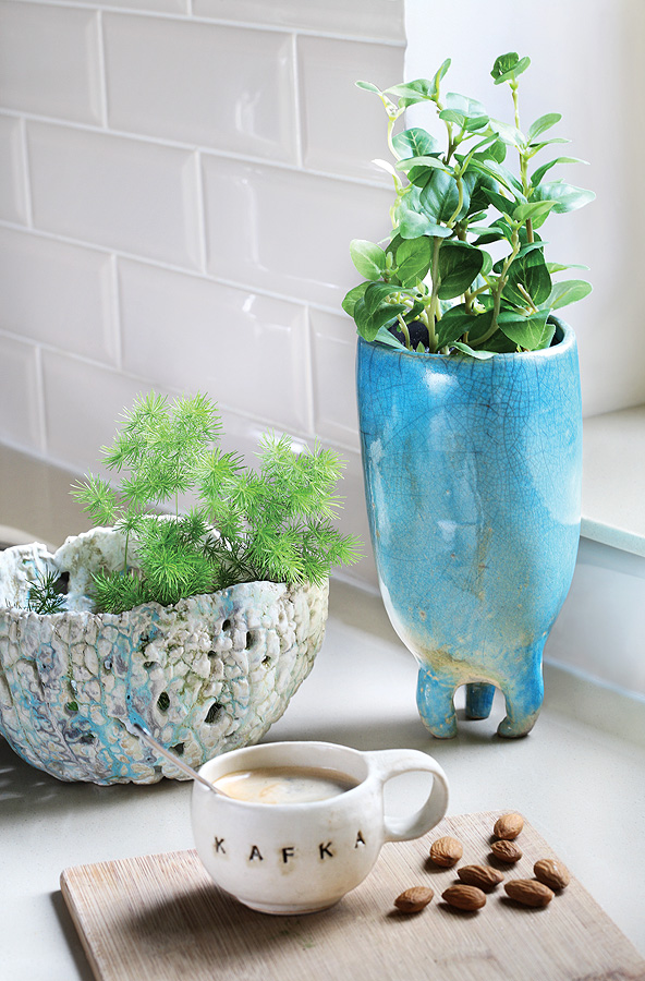 Sztuką może być nawet liść kapusty, pod warunkiem że zobaczysz w nim piękno – jak ceramiczka Kasia Stefańska-Białek. Pijemy kawę z ręcznie toczonych, delikatnych kubków, na których odciśnięte są ślady palców Kasi. Turkusowe kamionki wnoszą do domu blask, choć wcale nie błyszczą. Kasia nie przepada za rzeczami, które lśnią, nawet szkliwo nakłada tylko tam, gdzie to konieczne, czyli we wnętrzach mis. – Zawsze staram się zachować kolor, chropowatą fakturę, su