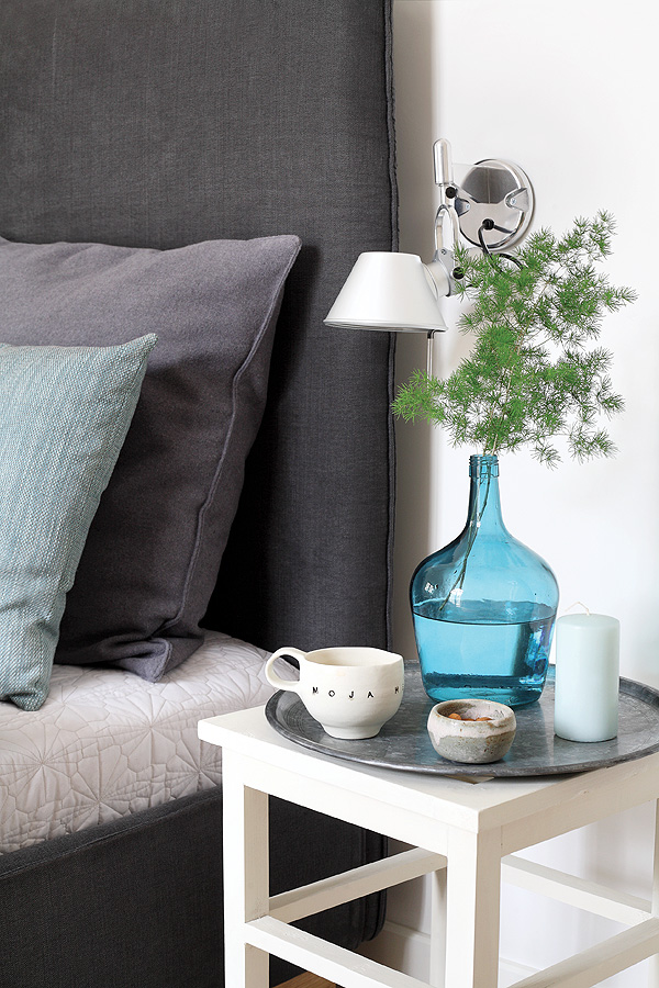 Łóżko z ruchomym zagłówkiem to NAP, szklany wazon-butla z Meubles De Charme. Poduchy, narzuta w sypialni - Malabelle.