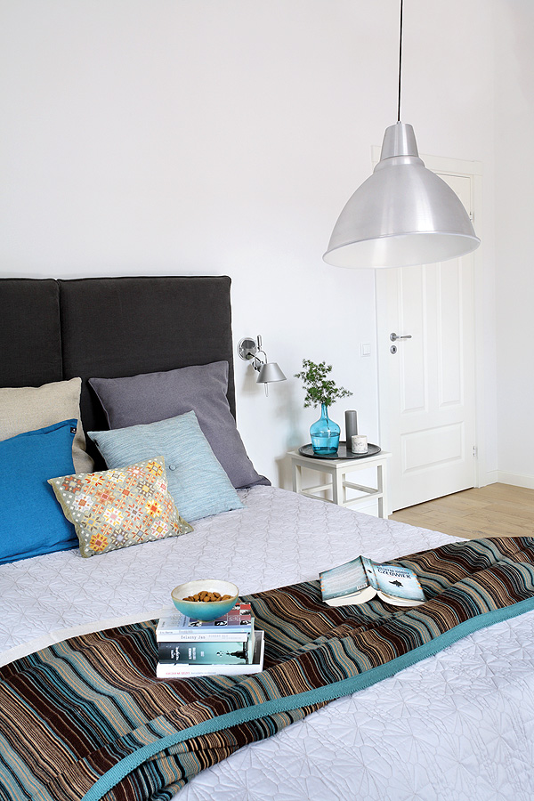 Łóżko z ruchomym zagłówkiem to NAP, szklany wazon-butla z Meubles De Charme. Poduchy, narzuta w sypialni - Malabelle.