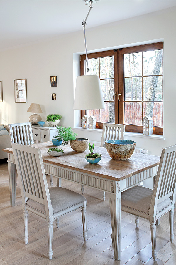 Stół z tekowym szczotkowanym blatem oraz krzesła i komoda z Meubles de Charme. W sklepie można kupić ceramikę Kasi.