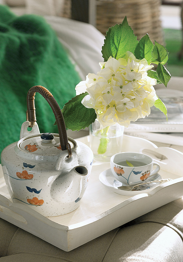 W domu dominuje biel przełamana zielenią, beżem i sieną. Kolonialne akcenty: bambusowe rolety, łóżko w