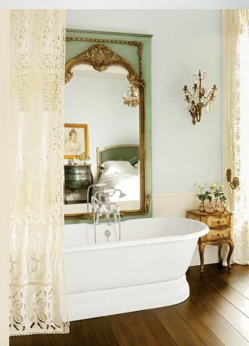 Romantyczna łazienka z koronkową zasłoną. W ogromynym weneckim lustrze odbija się Biała sypialnia.
