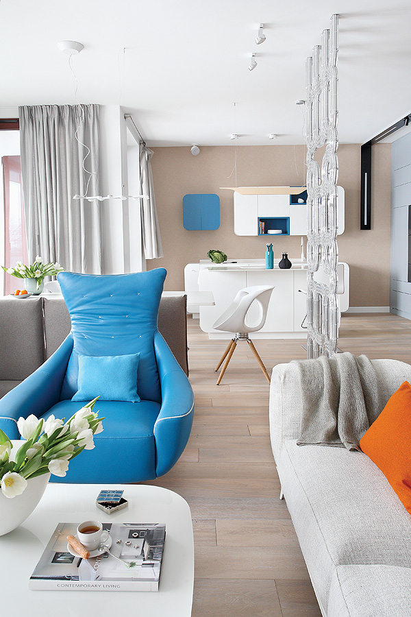 Błekit w obiciach foteli nawiązuje do rzeki, która widać za oknem.
