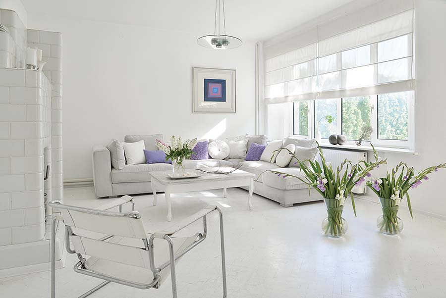 Salon z wielkimi oknami i piecem kaflowym. Fioletowe akcenty przełamują biel.