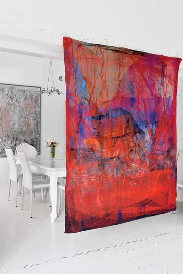 W domu jest ogromna pracownia, ale najchętniej artystka wykorzystuje deskę z gwoździkami zawieszoną między salonem a jadalnią. Upina na niej, a potem zszywa strzępki tkanin.