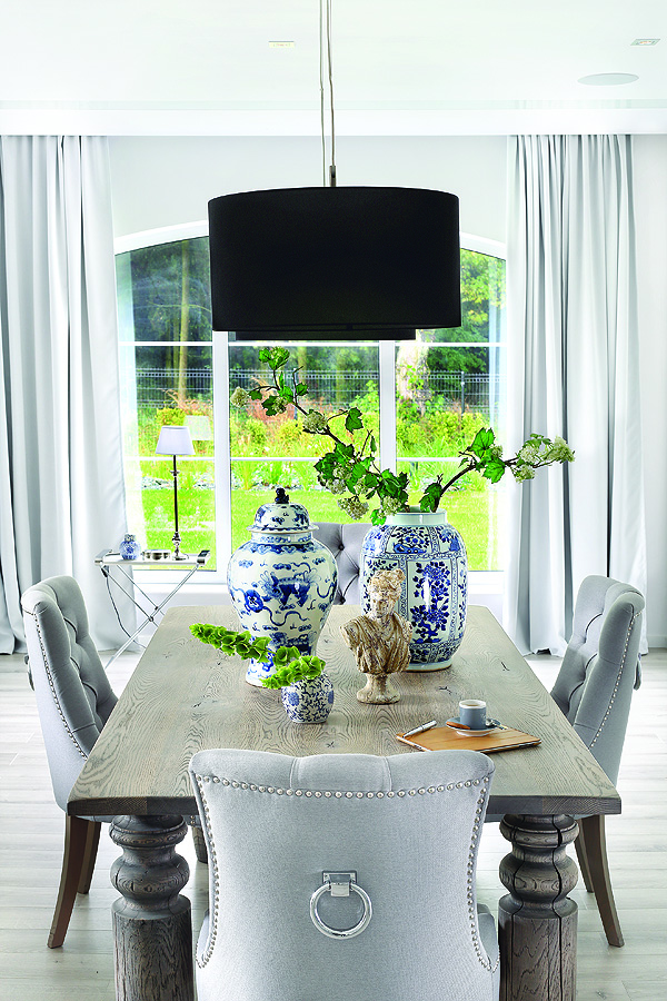 Do dużego masywnego stołu od firmy Jadik pasują fotele ze srebrnymi uchwytami z Decolor i kobaltowe wazony od Casa Mia.