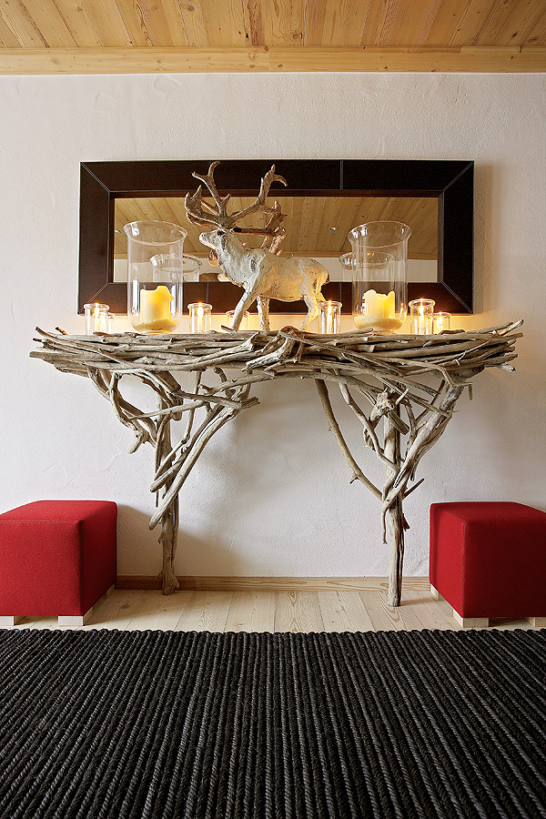 Prosto z natury: konsolę z patyków Anke znalazła ne eBayu, rogi w holu są nie tylko dekoracją, ale i wieszakami.