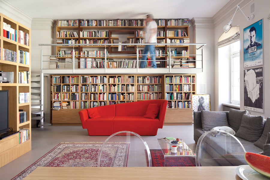 Mieszkanie w kamienicy urządzone przez książki. Pomysłowa i praktyczna antresola z książkami.